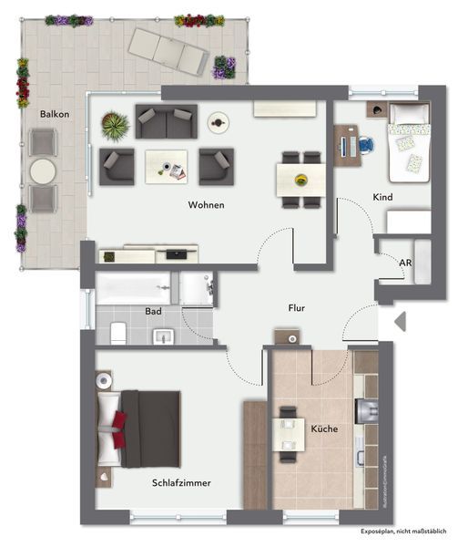 Der durchdachte Grundriss der Wohnung umfasst ein lichtdurchflutetes Wohnzimmer, eine Küche mit Essplatz, eine geräumige Diele, einen praktischen Abstellraum, ein Schlafzimmer sowie ein Kinderzimmer. Das Badezimmer ist mit einer Dusche, einer Badewanne und einem WC ausgestattet.