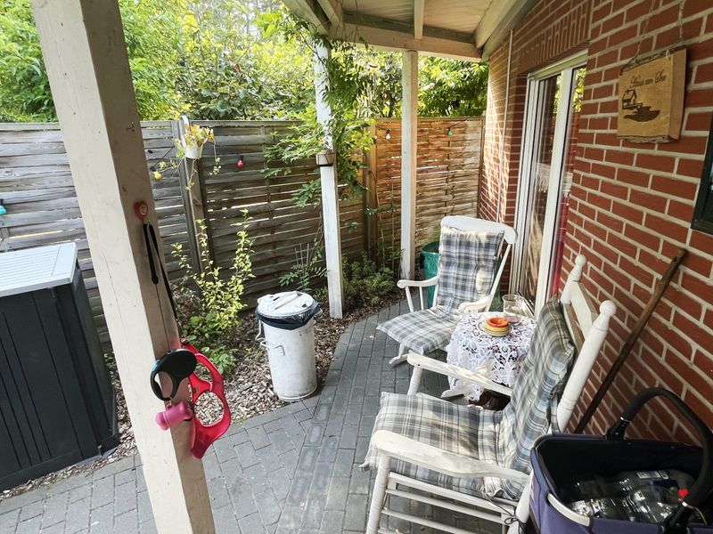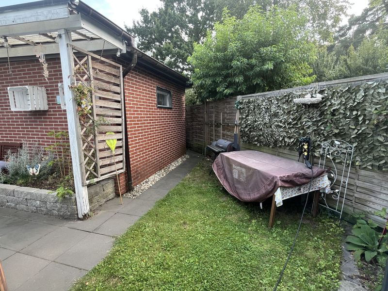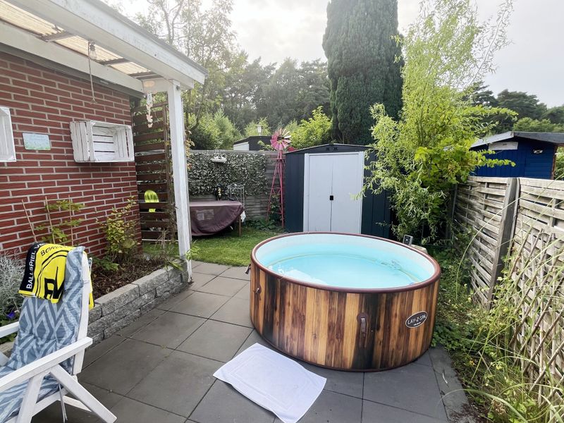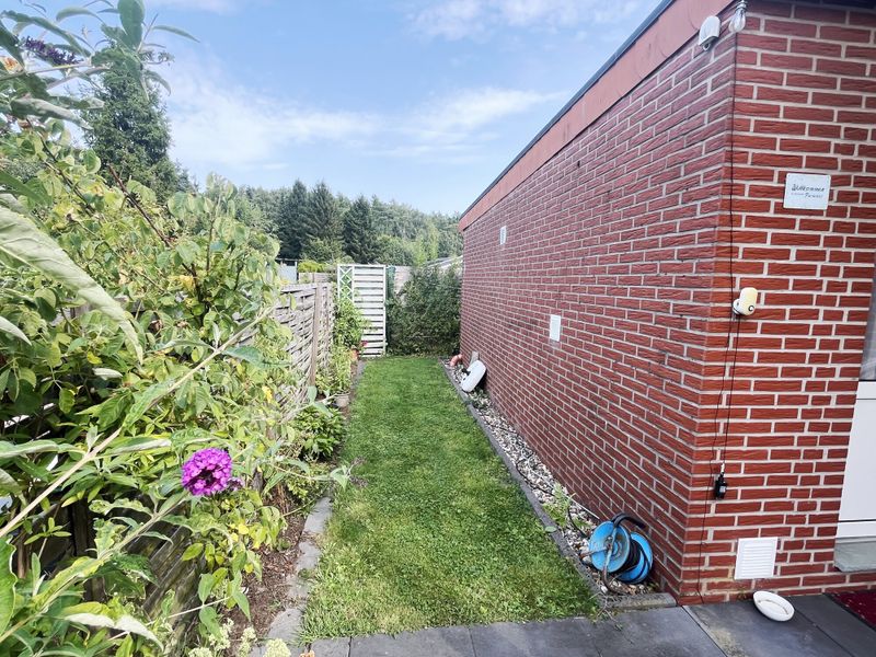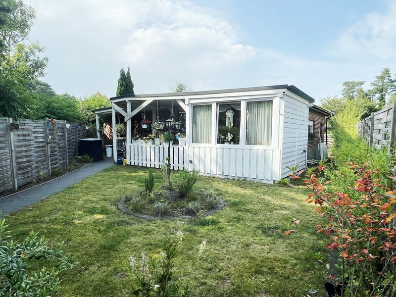 Das Herzstück des Hauses bildet das großzügige Wohnzimmer mit schöner integrierter offener Küche. Der angrenzende Wintergarten bietet einen direkten Zugang zur überdachten Terrasse und wird z. Z. als Esszimmer genutzt. Ein gemütlicher Wohlfühlort mit Blick in den Garten, den Sie den ganzen Tag genießen möchten. Auf der Rückseite des Hauses wurde ein weiterer kleiner Terrassenbereich mit einem Gartenhaus und Außenwasseranschluss angelegt. Im Haus wurde das Raumangebot mit einem praktischen Abstellraum, einem kleinen Flurbereich, einem modern gestalteten Badezimmer mit begehbarer ebenerdiger Dusche mit Waschmaschinenanschluss und einem Schlafzimmer vervollständigt.