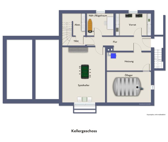 Ergänzend steht ein Vollkeller mit drei separaten Räumen zur Verfügung, der reichlich Stauraum sowie Nutzungsmöglichkeiten für Hauswirtschaft oder Hobby bietet.