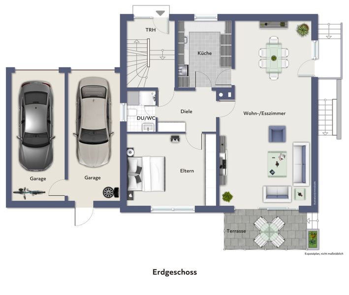 Im Erdgeschoss befindet sich eine großzügig geschnittene Wohneinheit mit direktem Zugang zur Terrasse und dem südlich ausgerichteten Garten. Diese Wohnung zeichnet sich insbesondere durch ihre helle, offene Atmosphäre und eine komfortable Raumaufteilung aus, die ein angenehmes Wohnen ermöglicht.