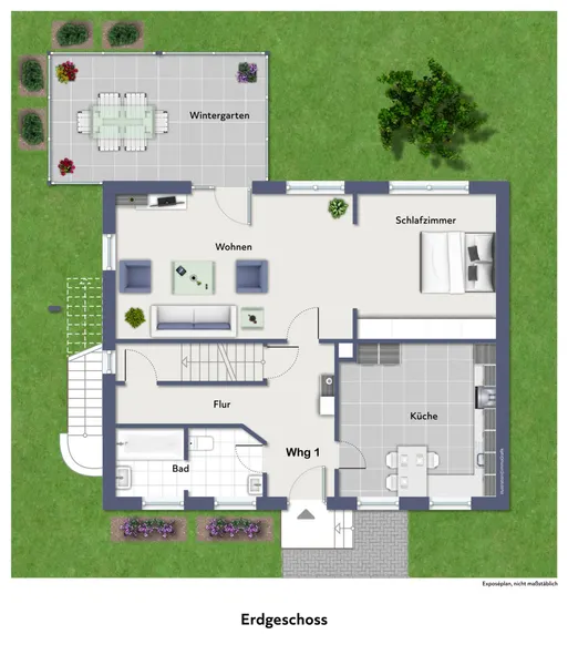 Ebenfalls vom Flur aus gelangt man in die Küche mit Essbereich, ergänzt durch einen separaten Wohnbereich, bestehend aus einem Wohn- und einem Schlafzimmer. Besonders positiv präsentiert sich der Übergang vom Wohnzimmer in den beheizten Wintergarten, der als heller Zusatzraum den Blick in den Garten öffnet.