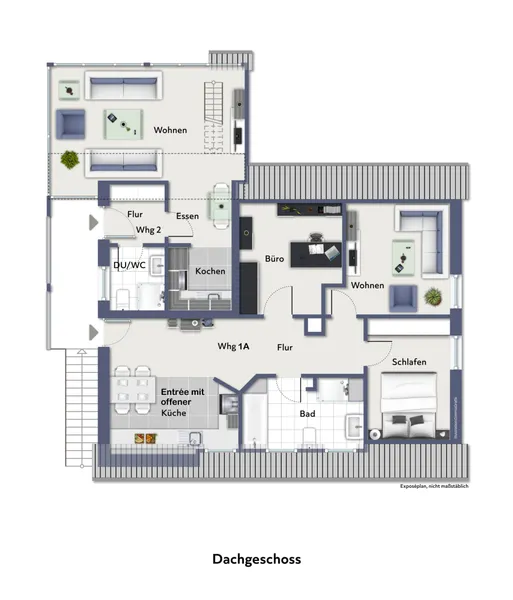 Im Dachgeschoss setzt sich die funktionale Aufteilung fort. Hier befinden sich zwei weitere Wohneinheiten, welche seit 2004 dauerhaft vermietet sind.
