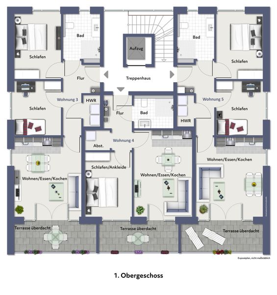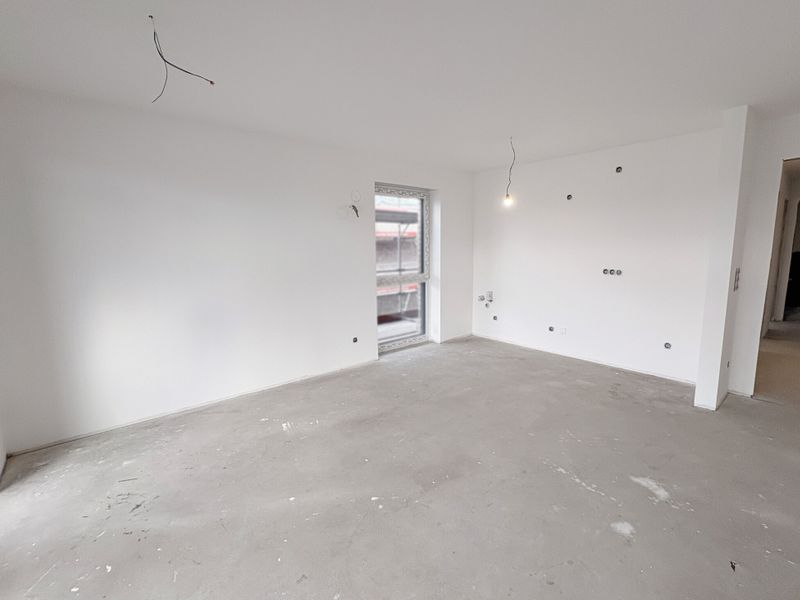 Im 1. Obergeschoss erwartet Sie eine großzügige Wohnung mit ca. 68 m² Wohnfläche. Das durchdachte Raumkonzept umfasst einen offenen, hellen Wohn- und Essbereich, zwei komfortable Schlafzimmer, ein stilvolles Badezimmer mit ebenerdiger Dusche sowie einen praktischen Abstellraum mit Anschlüssen für Waschmaschine und Trockner. Die überdachte Terrasse/ Balkon mit Südausrichtung lädt dazu ein, sonnige Stunden im Freien zu genießen.