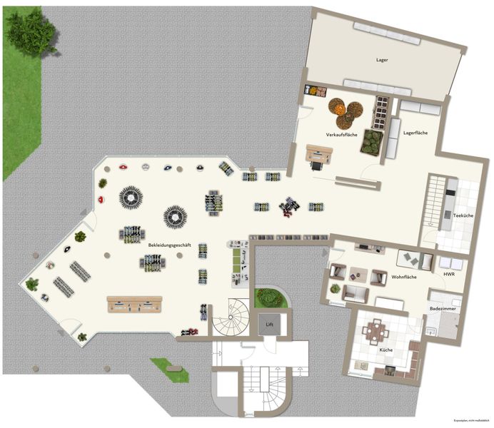 Ferner besteht die Möglichkeit das Ladenlokal zu unterteilen und die hintere Teilfläche zu Wohnzwecken dem Wohnhaus zuzuschlagen. Auf diese Weise wurde die Fläche in der Vergangenheit bereits genutzt.
