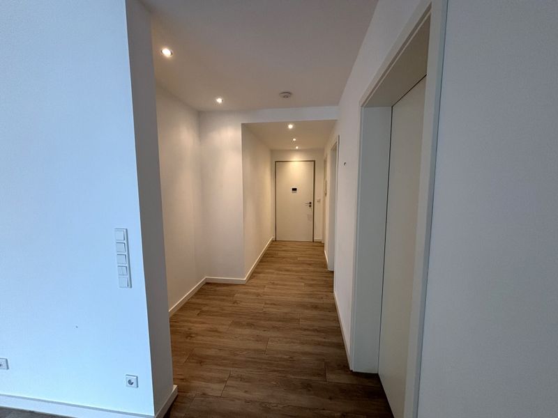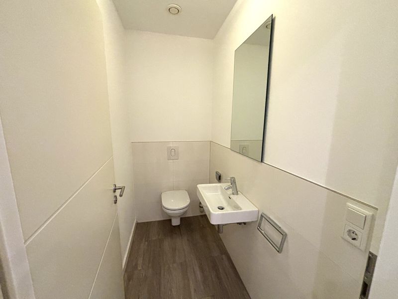 Praktisch ergänzt wird die Wohnung durch ein separates Gäste WC sowie ein Badezimmer mit bodengleicher Dusche, Doppelwaschtisch und Handtuchheizkörper, was den Alltag zu zweit deutlich entspannter macht. Ein Hauswirtschaftsraum innerhalb der Wohnung schafft Ordnung und kurze Wege für Waschmaschine, Trockner und Vorräte. Für ein gleichmäßiges, behagliches Wohnklima sorgt die Fußbodenheizung, die sich unaufdringlich in die Gestaltung einfügt.