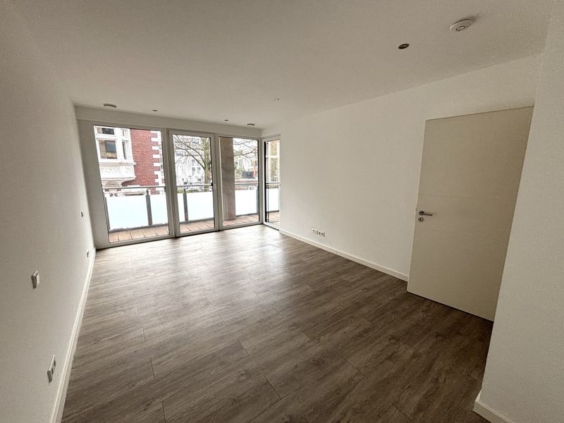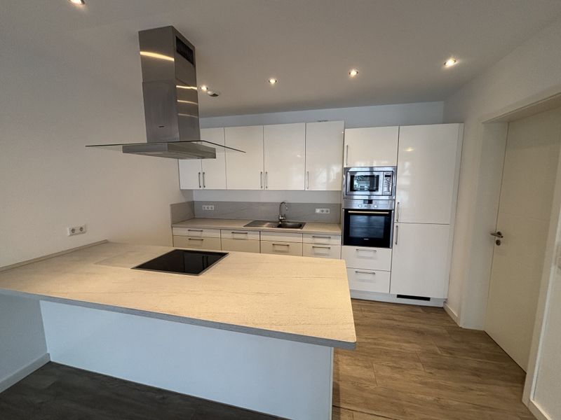 Das Gebäude stammt aus dem Baujahr 2013 und präsentiert sich insgesamt in einem gepflegten, modernen Erscheinungsbild. Über den Personenaufzug gelangen Sie bequem zur Wohnung, die mit ca. 97 m² Wohnfläche und zwei Zimmern ein großzügiges Raumgefühl bietet, ohne dabei unübersichtlich zu wirken. Bereits der Flur empfängt mit klaren Linien und einer angenehmen Breite, sodass Garderobe und Ankommen entspannt gelingen. Von hier aus öffnet sich der Wohnbereich als zentraler Mittelpunkt: ein offener, heller Raum zum Kochen, Essen und Wohnen, der durch die großen Fensterflächen und den direkten Zugang nach draußen besonders einladend wirkt. Die Küche ist als moderne Einbauküche mit Insel und integrierten Geräten angelegt, wodurch Kochen und Zusammensein harmonisch ineinandergreifen und zugleich ausreichend Arbeitsfläche zur Verfügung steht.