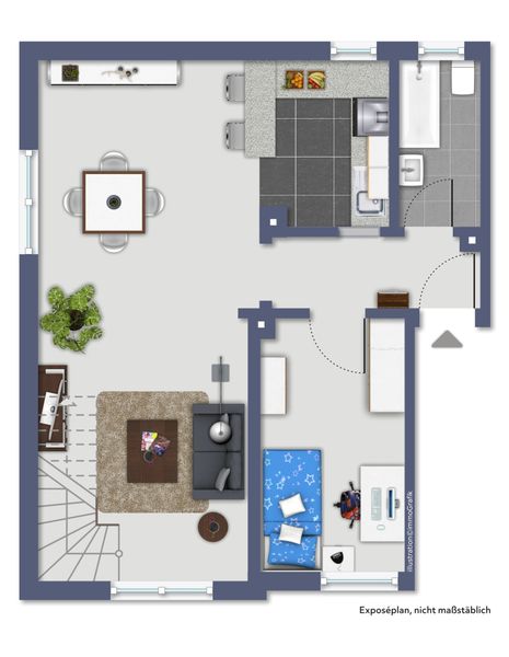 Der offen gestaltete Wohn-, Ess- und Küchenbereich bildet das Herzstück der Wohnung und lädt zu geselligen Stunden und entspannten Abenden ein. Ein Kinderzimmer sowie das zeitlos weiß geflieste Bad ergänzen den Grundriss auf dieser Ebene.