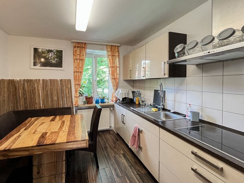 Über die Treppe erreichen Sie das 1. Obergeschoss mit weiteren Wohnraummöglichkeiten. Auch hier finden Sie eine geräumige Küche, ein helles, großes Wohnzimmer und zwei Schlafzimmer. Das Badezimmer bietet Ihnen eine Badewanne mit WC.