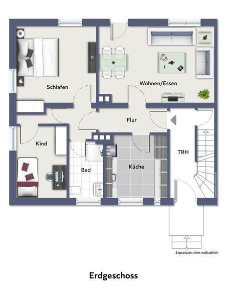 Beginnend im Erdgeschoss betreten Sie den Flur, der Zugang zu allen wichtigen Räumen verschafft. Eine helle, geräumige Küche, ein Badezimmer mit Dusche und WC, zwei praktikable Schlafzimmer und ein großer, lichtdurchfluteter Wohn- und Essbereich mit Zugang zur überdachten Terrasse finden hier ihren Platz.