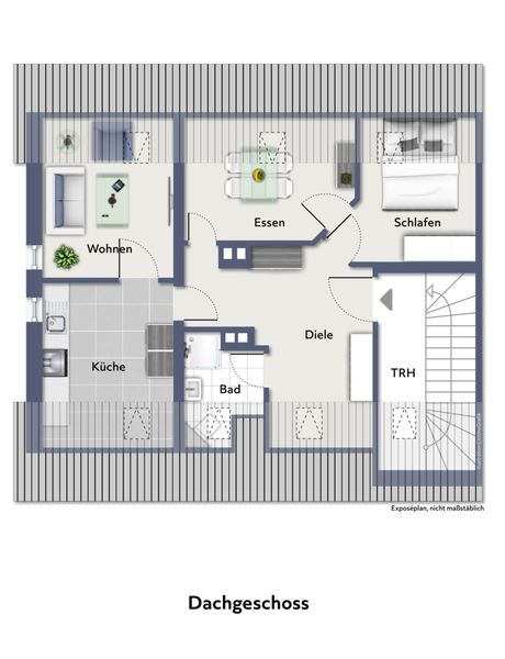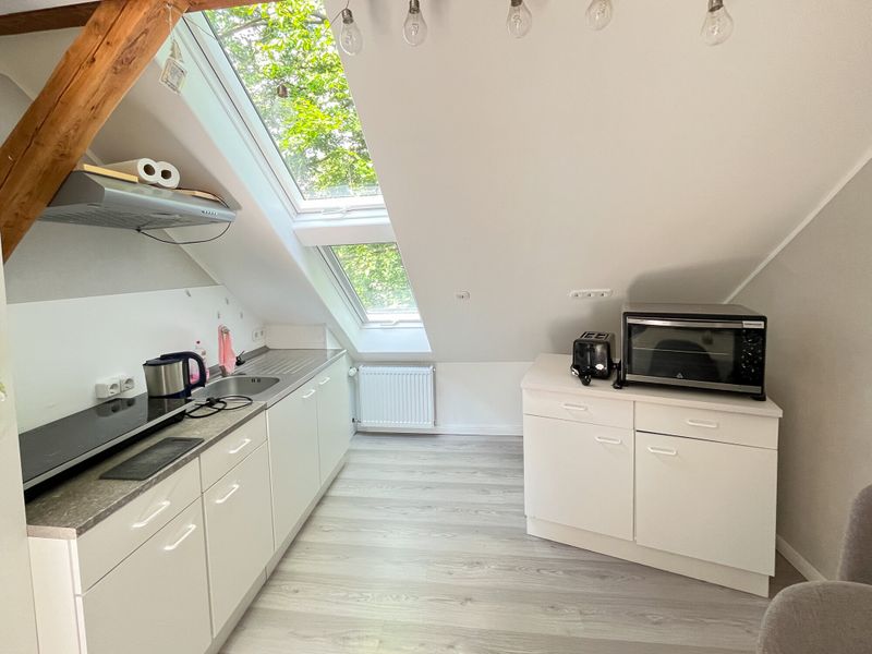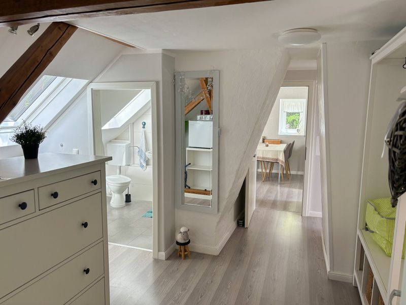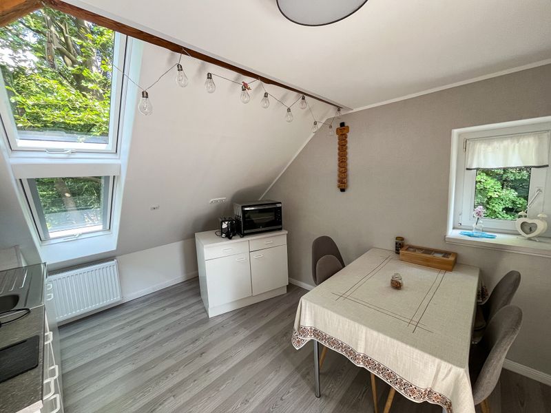 Eine Etage weiter im Dachgeschoss präsentiert Ihnen das Mehrfamilienhaus eine große, praktische Diele im Eingangsbereich, ein Badezimmer mit Dusche und WC, eine Küche, ein Esszimmer und ein Wohnzimmer. Im Schlafzimmer gelangen Sie über eine Holztreppe auf die Schlafempore.