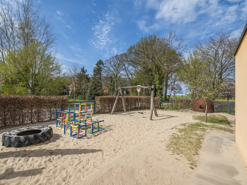 Der Außenbereich ist wie für eine Kindertagesstätte gewöhnlich mit viel Freifläche zum Spielen und passt zum Gesamtbild der Immobilie.