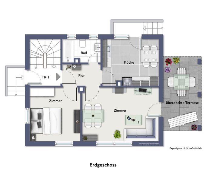 Die vom Wohnzimmer aus zugängliche, überdachte Terrasse ermöglicht die Nutzung eines geschützten Außenbereichs auch bei ungünstiger Witterung.