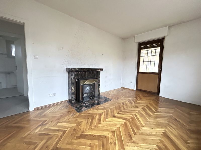 Im Erdgeschoss liegt ein Wohnbereich, der durch einen Kamin geprägt wird und mit seinem Parkettboden in Fischgrätenmuster eine angenehme Grundlage für eine spätere Modernisierung mitbringt. Angrenzend befindet sich ein weiterer Raum, der sich je nach Bedarf als Esszimmer, Arbeitsbereich oder zusätzliches Zimmer nutzen lässt. Die Küche ist separat angeordnet und verfügt über einen direkten Ausgang in den Garten. Ein Bad im Erdgeschoss ergänzt die Ebene funktional.
