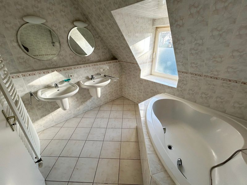 Das Dachgeschoss besticht durch drei gemütliche Schlafzimmer und zwei Bäder – eines mit Dusche und das andere mit Doppelwaschbecken und einer großzügigen Badewanne. Eine Treppe ermöglicht den Aufstieg auf den praktischen Spitzboden, der zusätzlichen Raum bietet. Der Vollkeller des Hauses dient als optimaler Stauraum für Ihre Habseligkeiten.