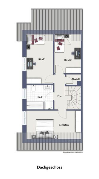 Das Dachgeschoss überzeugt mit einem gut durchdachten Grundriss: Ein gut geschnittenes Elternschlafzimmer, zwei helle Kinderzimmer sowie ein modernes Tageslichtbad mit Dusche und Badewanne bieten viel Platz für die ganze Familie. Ein weiterer Abstell-/Heizungsraum rundet das Platzangebot sinnvoll ab.
