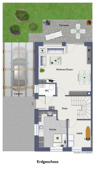 Zu der Doppelhaushälfte ist ein Carport-Stellplatz, ein Geräteraum sowie ein eigener Gartenbereich mit Terrasse zugeordnet.