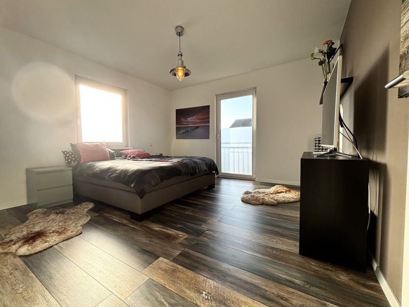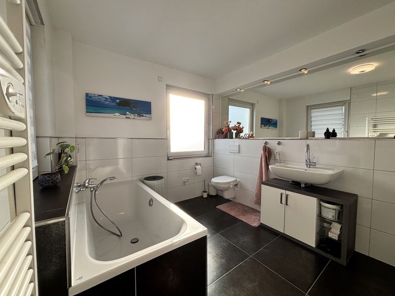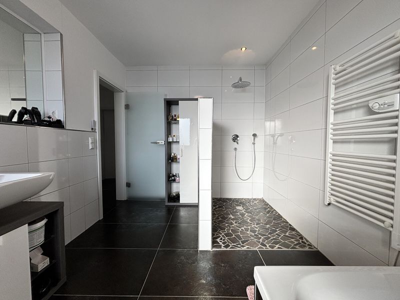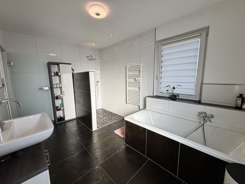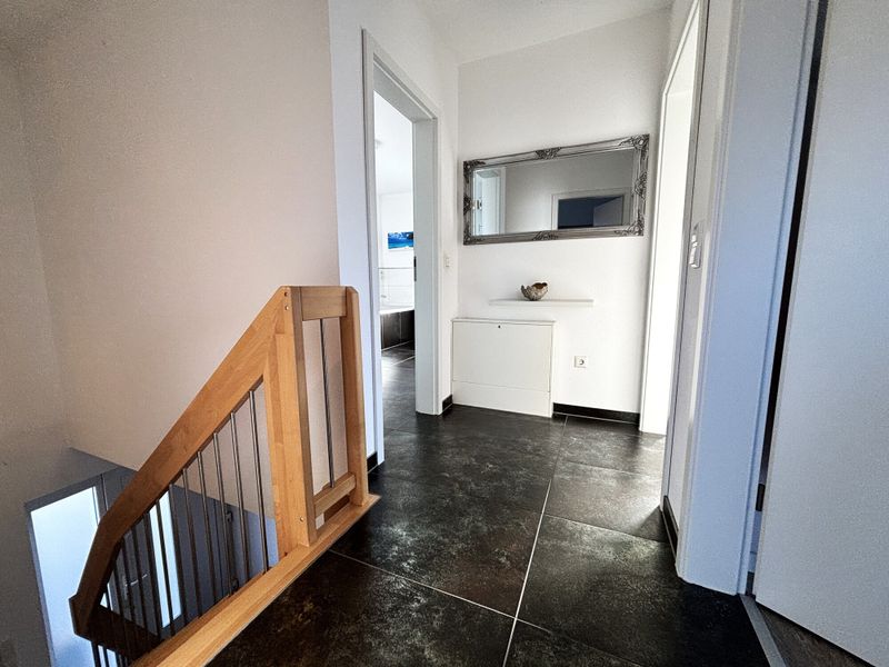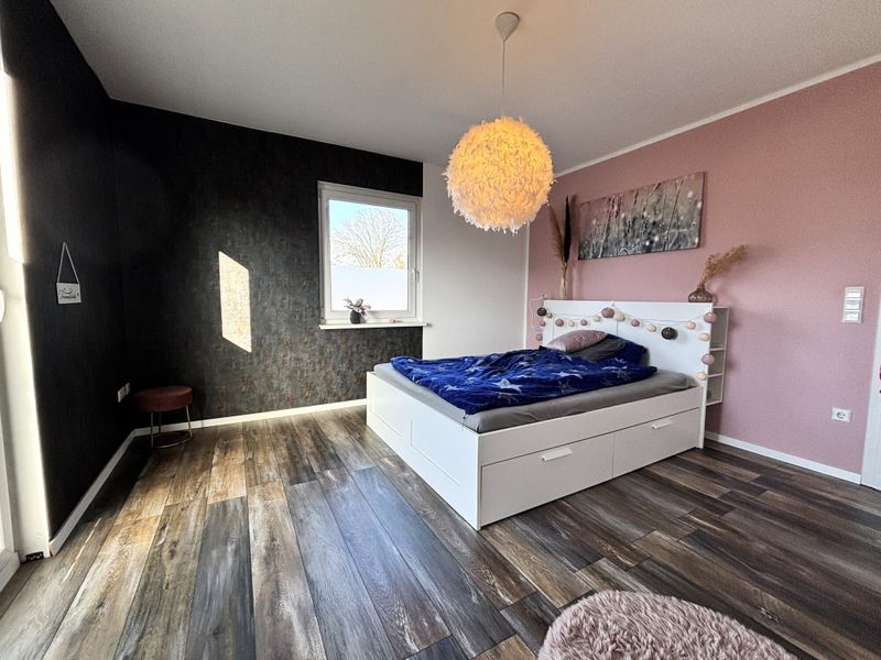 Über die Treppe gelangt man ins Obergeschoss, das mit insgesamt drei Zimmern im Haus eine flexible Nutzung ermöglicht. Neben dem Elternschlafzimmer lässt sich ein weiterer Raum gut als Kinderzimmer gestalten, während ein zusätzliches Zimmer je nach Lebensphase als Homeoffice, Hobbyraum, kleines Kinderzimmer oder Gästezimmer dienen kann. Ebenfalls im Obergeschoss befindet sich das moderne Bad mit Wanne und riesiger Dusche.