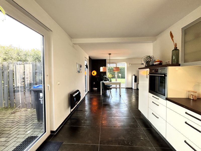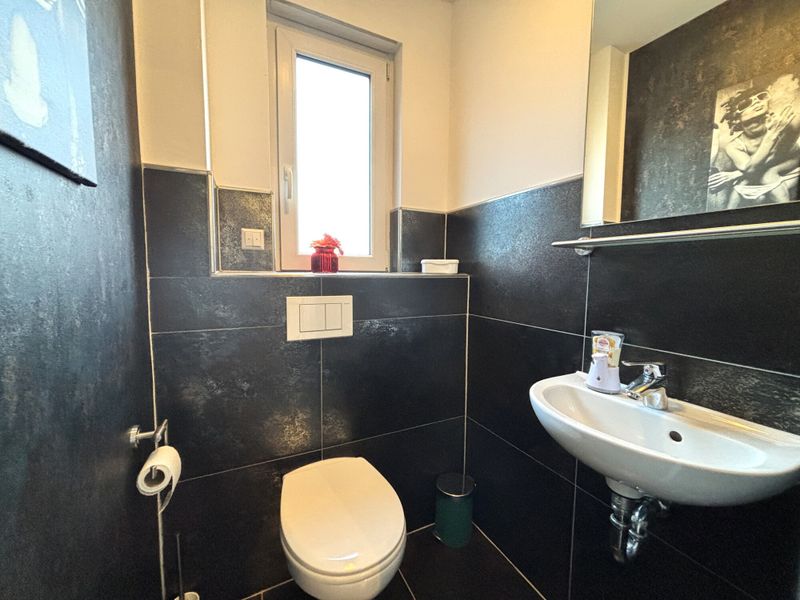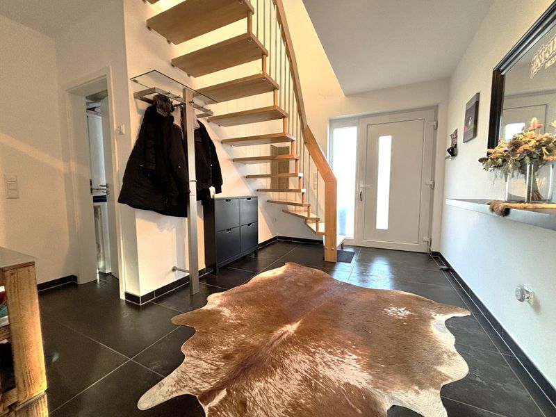 Schon der erste Eindruck im Eingangsbereich wirkt aufgeräumt und einladend, mit Platz für Garderobe und den Dingen, die im Alltag schnell griffbereit sein sollen. Von hier aus öffnet sich der großzügige Wohn- und Essbereich, der durch große Fensterflächen und Terrassentüren viel Tageslicht erhält und den Blick in den Garten lenkt. Die Küche ist als Einbauküche bereits vorhanden und im Kauf enthalten, was den Start angenehm unkompliziert macht und zugleich eine solide Basis für gemeinsames Kochen schafft. Praktisch ergänzt wird das Erdgeschoss durch ein separates Gäste WC mit Fenster, das sich im Alltag als spürbarer Komfort erweist. Ebenfalls befindet sich in dieser Etage der Hauswirtschaftsraum, der Platz für Waschmaschine und Trockner besitzt.