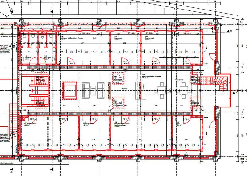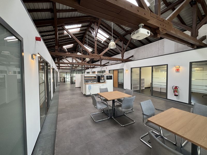 Im 1. Obergeschoss des Objektes befinden sich aktuell zwei Besprechungsräume, eine Küchenzeile mit angegliederten Sitzgelegenheiten und Freiflächen für Veranstaltungen sowie weitere Büroräume. Auch hier können die Flächen nach Ihren Vorstellungen angepasst werden.