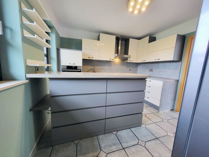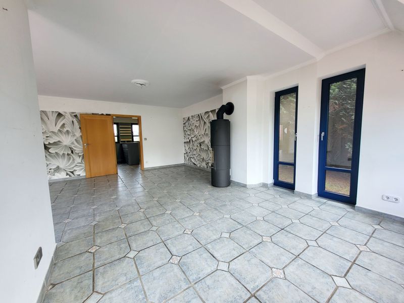 Das großzügige, helle Wohnzimmer ist das Herzstück des Hauses und verfügt über einen drehbaren Kaminofen, der an kühlen Abenden eine gemütliche Atmosphäre schafft. Die außergewöhnlichen Fensterformen lassen viel Tageslicht herein und verleihen dem Raum eine besondere Eleganz. Praktischerweise finden Sie hier eine Einbauküche vor, die nahtlos in das Ambiente des Hauses integriert ist. Diese Küche bietet neben viel Stauraum alles, was Sie benötigen, um Ihre Lieblingsgerichte zuzubereiten, und passt perfekt zum Stil und Charme Ihres neuen Heims.