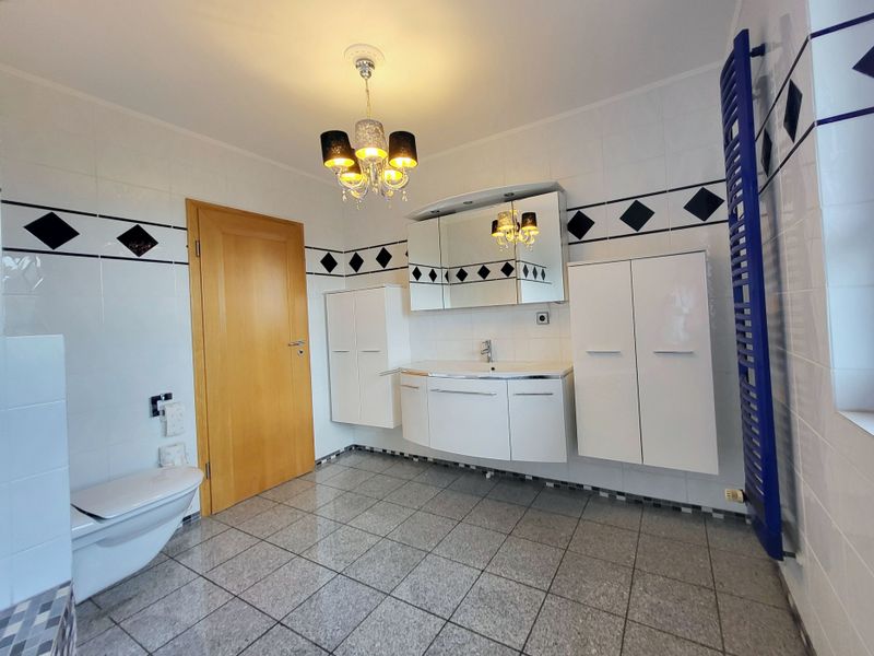 Die Elektronik des Hauses wird durch ein modernes Bus-System gesteuert, das für zeitgemäßen Komfort sorgt. Im Badezimmer erwartet Sie eine Einrichtung in klassischen Schwarz-Weiß-Hochglanzfarben, die zeitlose Eleganz ausstrahlt. Auch das Gäste-WC besticht durch seine exquisite Gestaltung mit viel Liebe zum Detail.