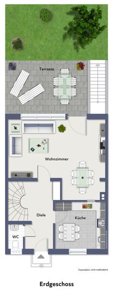 Der pflegeleichte Garten mit großer überdachter Terrasse bietet vielfältige Flächen für Freiluftliebhaber. Richten Sie sich hier eine neue Wohlfühloase ein oder nutzen Sie diesen für Festivitäten an warmen Sommertagen. Mit seiner Südausrichtung genießen Sie den Sonnenschein bis in die Abendstunden hinein.