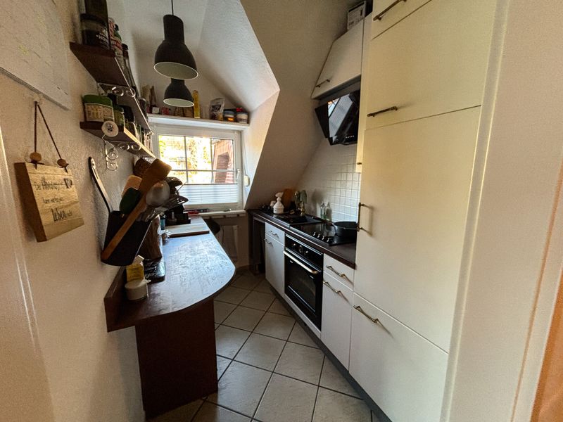 Die Küche ist funktional in den Wohnbereich eingebunden und ermöglicht eine kompakte, alltagstaugliche Organisation. Das Schlafzimmer liegt separat und wirkt durch die Dachgeschosslage besonders gemütlich und charmant,. Positiv präsentiert sich auch das Tageslichtbad, das mit Dusche, Badewanne, WC und Waschtisch eine vollständige Ausstattung bietet und damit sowohl für den schnellen Start in den Tag als auch für entspannte Abendroutinen geeignet ist.