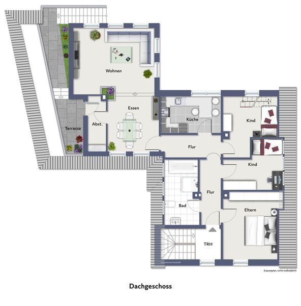 Die zweite Wohneinheit verteilt sich auf das Obergeschoss und den Spitzboden und wurde im Zuge des Anbaus im Jahr 1989 errichtet. Der Spitzboden wurde 1993 nachträglich ausgebaut. Hier empfängt Sie ein eigenständig nutzbarer Grundriss mit Wohn- und Essbereich, Küche, Bad, vier Schlafzimmern und einem zusätzlichen Duschbad. Der Anbau wirkt hell und funktional, sodass ein abgeschlossener Haushalt problemlos realisierbar ist. Der Abstellraum in der Garage kann von der 2. Wohneinheit flexibel genutzt werden, beispielsweise für die Unterbringung von Mülltonnen und Gartengeräten. Außerdem laden die Dachterrasse und die Terrasse im Gartenbereich zum Verweilen in der Sonne ein.