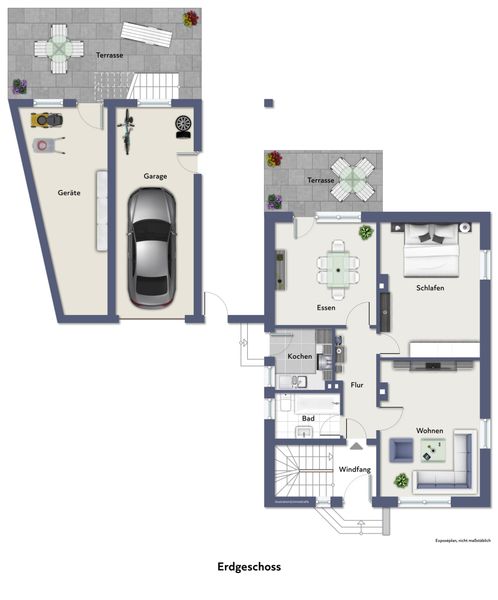 Die erste Wohneinheit, gelegen im Erdgeschoss des ursprünglichen Gebäudeteils von 1956, verfügt über ca. 69 m². Dieser Bereich präsentiert sich in einfacher Ausstattungsqualität und ist insgesamt renovierungsbedürftig – ein klarer Vorteil für Käufer, die ihr Zuhause gern nach eigenen Vorstellungen gestalten möchten. Die Wohnfläche verteilt sich auf ein Schlafzimmer, ein Wohnzimmer, ein Esszimmer mit Zugang zur Gartenterrasse, einer Küche und einem Badezimmer mit Wanne, Waschtisch und WC. Zu dieser Wohneinheit ist eine Garage mit einem Pkw-Stellplatz zugehörig.