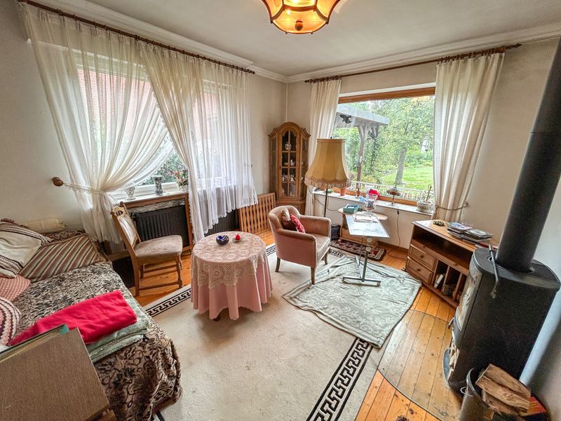 Im Erdgeschoss empfängt Sie ein weitläufiges Wohn-Esszimmer, das mit einem edlen Fischgrät-Parkettboden beeindruckt. Die angrenzende Küche mit gemütlicher Sitzgelegenheit sowie das Badezimmer mit Badewanne vervollständigen das Raumangebot auf dieser Ebene. Ein besonderes Highlight ist das Kaminzimmer, welches einen malerischen Blick in den grünen Garten eröffnet.