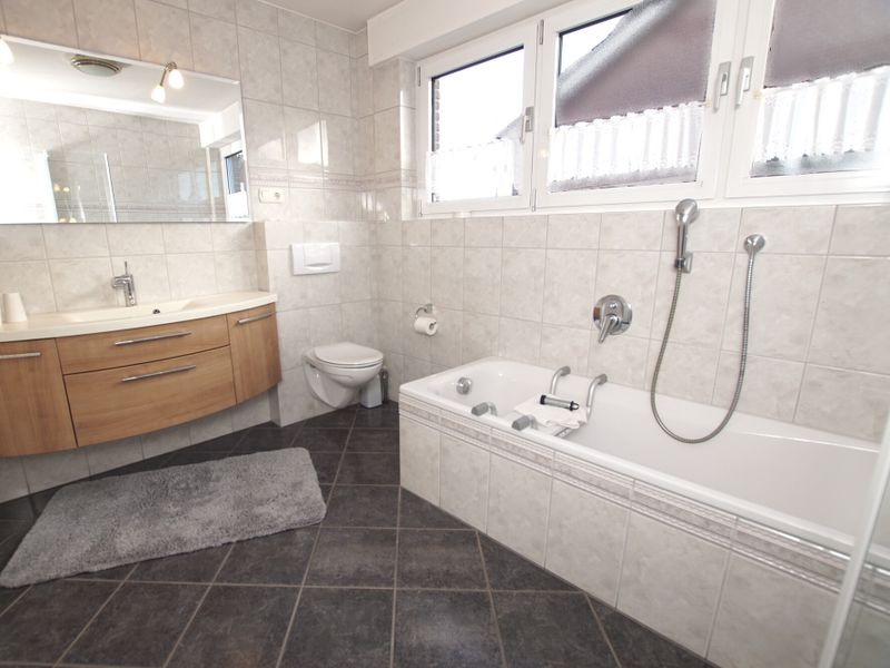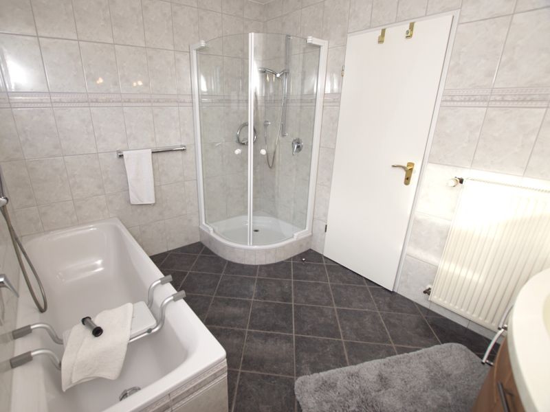 Im Obergeschoss befindet sich das geräumige Hauptschlafzimmer mit Zugang zu einem Balkon, der einen wunderbaren Rückzugsort bietet. Zwei weitere Kinderzimmer und ein helles Badezimmer mit Wanne, Dusche, WC und Waschbecken bieten genügend Platz für die Familie.
