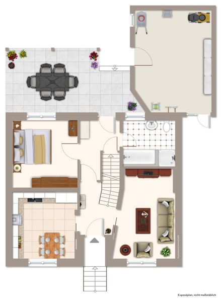 Besonders hervorzuheben ist die großzügige, überdachte Terrasse, die sich perfekt zum Entspannen im Freien eignet und den Blick auf den weitläufigen Garten freigibt. Das teilweise unterkellerte Massivhaus punktet zudem mit einem Nebengebäude, das viel Platz für Gartenutensilien, Fahrräder, Motorräder oder auch zum Werken bieten.