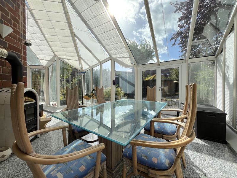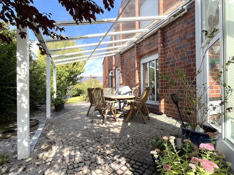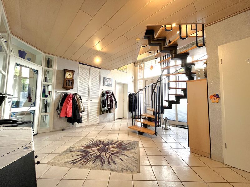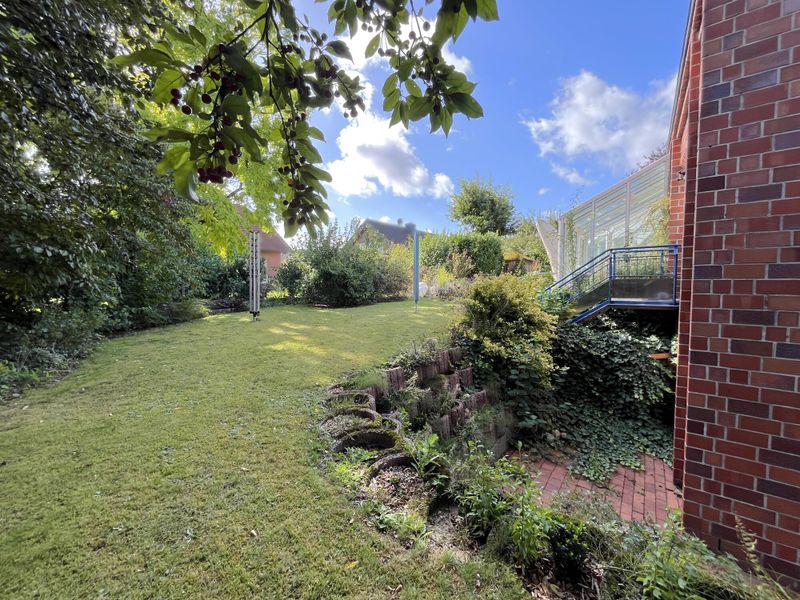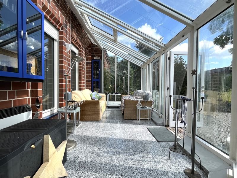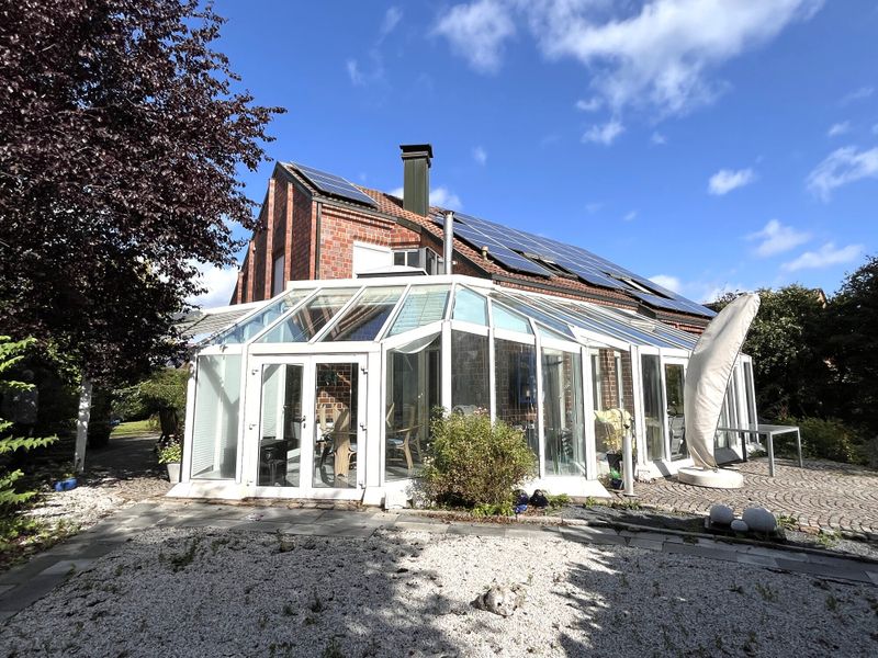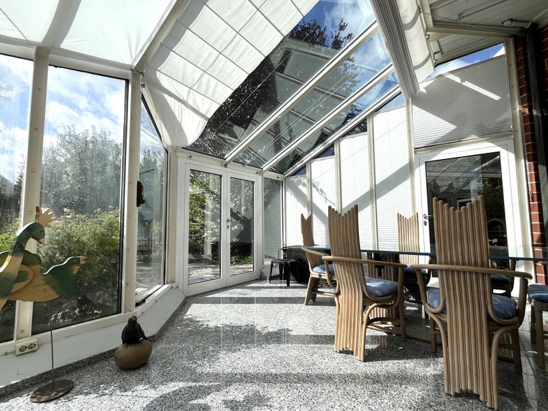 Das Herzstück des Hauses ist das großzügige Wohn-Esszimmer mit großen Fensterfronten und einem traditionellen Kachelofen, der für gemütliche Stunden sorgt. Die angrenzende überdachte Terrasse und der Garten bieten zusätzliche Entspannung und ermöglichen Ihnen, die Natur direkt vor Ihrer Tür zu genießen. Ein weiteres Highlight ist der Wintergarten mit eigenem Ofen, der zu jeder Jahreszeit ein perfekter Rückzugsort ist.