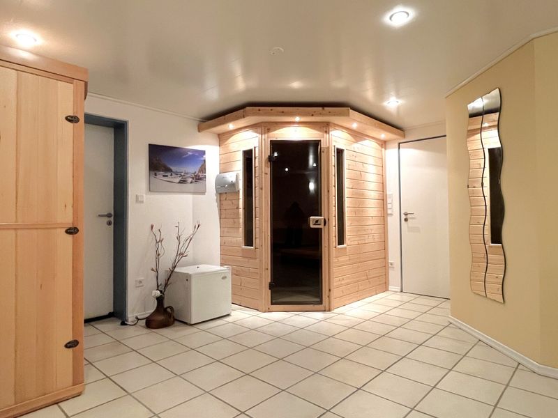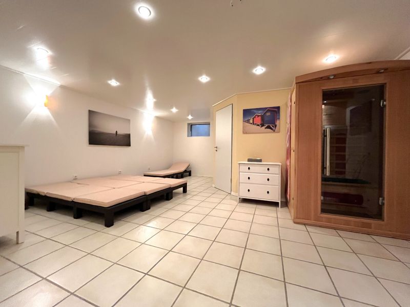 Erholung pur finden Sie auch im hauseigenen Wellnessbereich mit Sauna und Duschbad im Kellergeschoss – perfekt, um den Alltag hinter sich zu lassen. Zusätzlich befindet sich auf dieser Ebene ausreichend Stauraum sowie der Heizungskeller und auch ein Waschkeller.