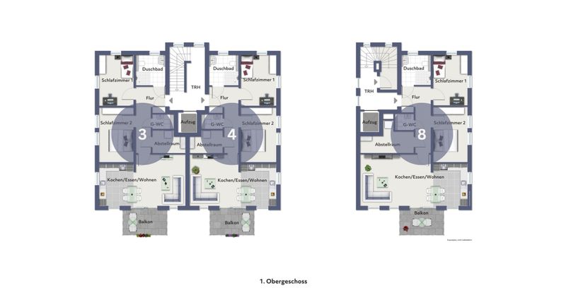 Beide Häuser erfüllen den KfW-40-Standard und setzen mit einer Luft-Wasser-Wärmepumpe sowie einer Photovoltaikanlage auf eine nachhaltige Energieversorgung.