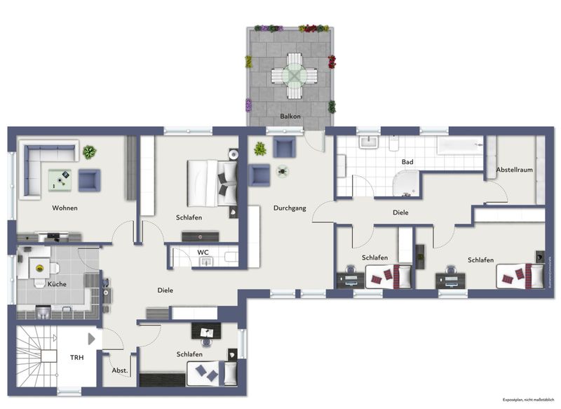 Das Herzstück der Wohnung bildet das große Wohnzimmer mit viel Tageslicht – ideal für gemütliche Stunden mit Familie und Freunden. Die Küche hält ausreichend Platzangebot für eine schöne Küche und einem großen Esstisch bereit – der perfekte Ort für gemeinsame Mahlzeiten und kulinarische Erlebnisse. Neben einem Gäste-WC stehen Ihnen vier Schlafräume zur individuellen Nutzung zur Verfügung. Zwei praktische Abstellräume bieten zusätzlichen Stauraum. Ein Durchgangszimmer eignet sich hervorragend als Büro oder Spielzimmer. Das Badezimmer ist mit einer Dusche, Waschtisch und WC ausgestattet und rundet das komfortable Wohnangebot ab.