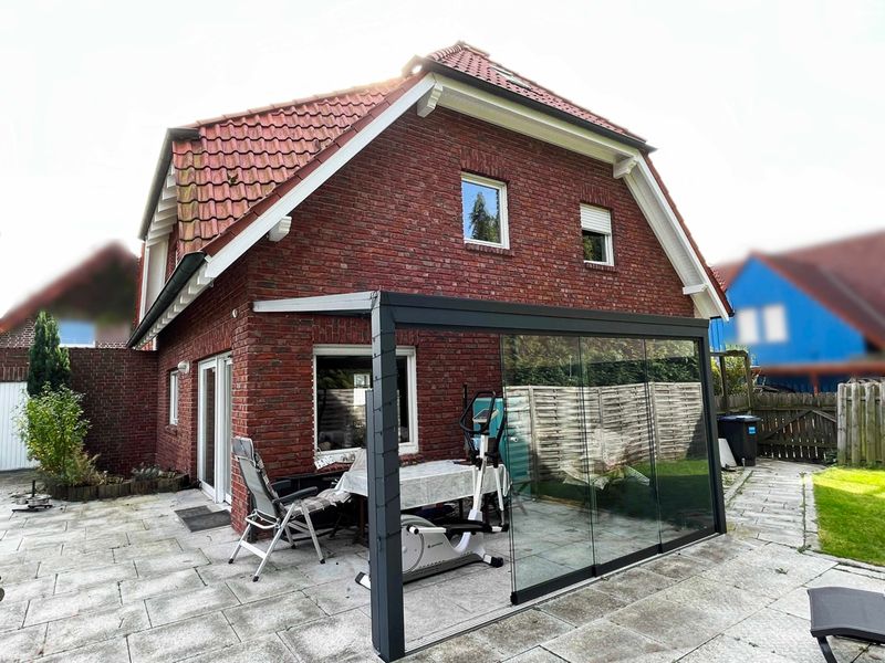 Der vollständig eingefriedete Garten ist ideal für entspannte Stunden im Freien. Die großzügige Terrasse lädt sowohl an sonnigen als auch an regnerischen Tagen zum Verweilen ein, dank eines teilweise überdachten Bereichs mit Seitenschutz.