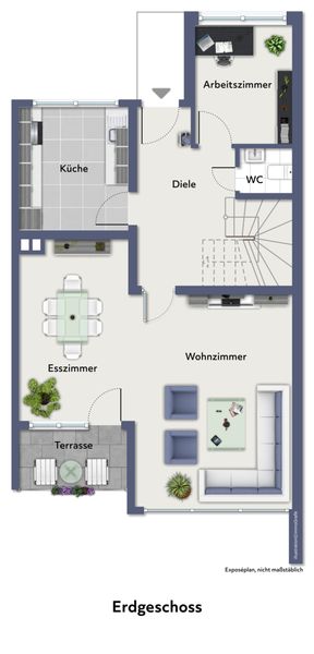Der Rundgang beginnt in der einladenden Diele, von der aus alle Räume des Erdgeschosses erreichbar sind. Ein separates WC sowie ein zusätzliches Zimmer, ideal als Homeoffice oder ruhiger Rückzugsort, ergänzen diese Ebene. Die Küche ist als abgeschlossener Raum konzipiert und erhält durch ein Fenster angenehmes Tageslicht. Mittelpunkt des Erdgeschosses ist der großzügige Wohnbereich, der gemeinsam mit dem angrenzenden Esszimmer ein harmonisches Zentrum für das Familienleben bildet. Von hier aus gelangen Sie direkt auf die Terrasse und in den Garten – ein grüner Rückzugsort, der sich perfekt als Erweiterung des Wohnraums anbietet.