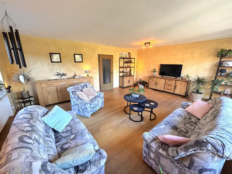 Schon beim Eintreten zeigt sich ein praktischer Grundriss: Im Eingangsbereich ist Platz für eine Garderobe, ergänzt durch ein Gäste WC, das den Alltag mit Besuch oder Kind spürbar erleichtert. Von hier aus öffnet sich der Weg in die Wohnbereiche. Das Wohnzimmer wirkt durch seine Größe und die Holzdielen warm und einladend. Viele Fensterflächen sorgen für angenehmes Tageslicht, und der direkte Zugang zur Terrasse verbindet das Wohnen ganz selbstverständlich mit dem Garten. Hier lässt sich der Blick ins Grün und über den liebevoll angelegten Teich genießen so, dass man den Tag entspannt ausklingen lassen kann. Ergänzt wird der Terrassenplatz durch einen weiteren Freisitz im hinteren Gartenbereich, sodass je nach Tageszeit und Stimmung unterschiedliche Lieblingsplätze zur Verfügung stehen.