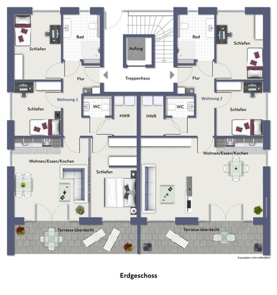 Im Erdgeschoss erwartet Sie eine großzügige Wohnung mit ca. 96 m² Wohnfläche. Das durchdachte Raumkonzept umfasst einen offenen, hellen Wohn- und Essbereich, drei komfortable Schlafzimmer – eines davon mit begehbarem Kleiderschrank –, ein stilvolles Badezimmer mit ebenerdiger Dusche, ein separates Gäste-WC sowie einen praktischen Abstellraum mit Anschlüssen für Waschmaschine und Trockner. Die überdachte Terrasse mit Südausrichtung lädt dazu ein, sonnige Stunden im Freien zu genießen.