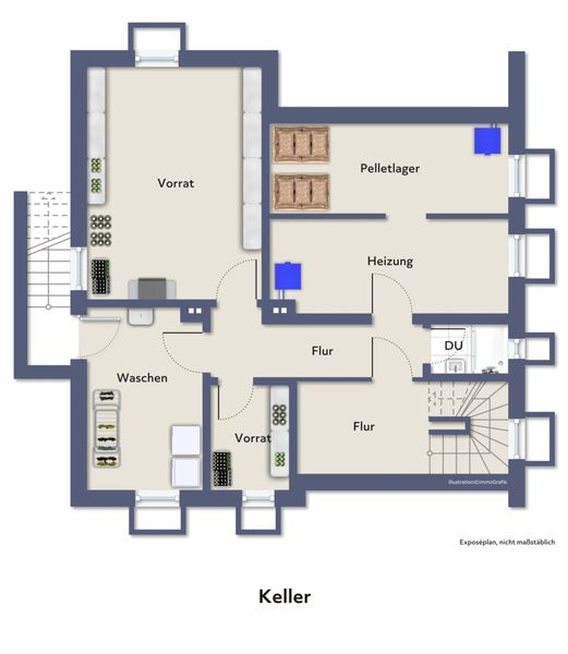 Abgerundet wird das Platzangebot durch den Vollkeller, der sich auf zwei Heizungsräume, zwei Vorratsräume, ein Gäste-WC, eine Waschküche und einen Abstellraum verteilt. Eine zusätzliche Außentreppe hält die Wege in den Garten kurz, sodass sich praktischerweise auch die Unterbringung von Gartenutensilien im Keller anbietet.