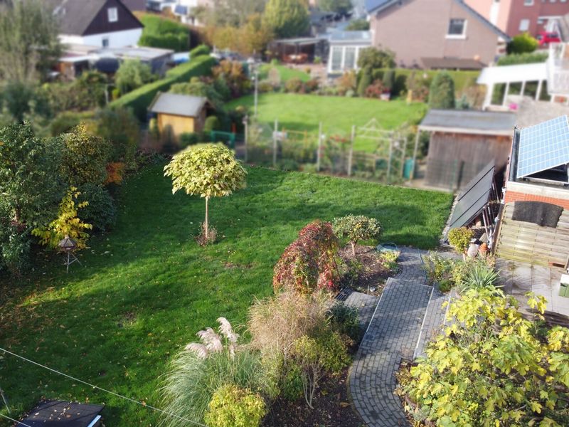 Der südlich ausgerichtete Gartenbereich verspricht nicht nur zahlreiche Sonnenstunden, sondern lädt auch zu entspannten Momenten mit Familie und Freunden auf der Terrasse ein. Hier haben Sie die Möglichkeit, Ihren persönlichen Gartentraum ganz nach Ihren individuellen Vorstellungen zu gestalten. Ein gepflegter Vorgarten mit Rasen empfängt Sie bereits beim Betreten des Grundstücks, während eine große, dichte Hecke den Garten zur Straße hin abschirmt und für Privatsphäre sowie eine angenehme, grüne Atmosphäre sorgt.