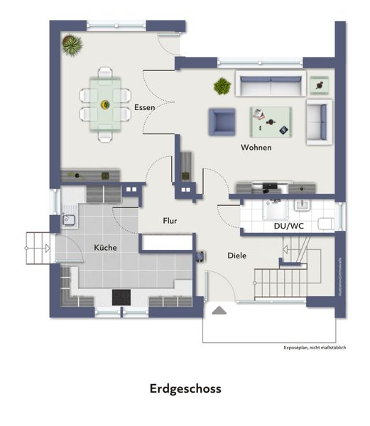 Das durchdachte und funktional gestaltete Raumkonzept erstreckt sich über ca. 112 m² Wohnfläche und bietet im Erdgeschoss ein großzügiges, lichtdurchflutetes Wohnzimmer mit Kamin, das zum Verweilen einlädt. Über eine elegante Flügeltür gelangen Sie in das separate Esszimmer, das direkten Zugang zur gepflegten, gepflasterten Terrasse und zum Garten ermöglicht – ideal für gesellige Stunden im Freien. Die geräumige Küche mit praktischem überdachten Nebeneingang sowie das Gäste-WC mit Dusche vervollständigen das attraktive Grundrisskonzept und sorgen für hohen Wohnkomfort.