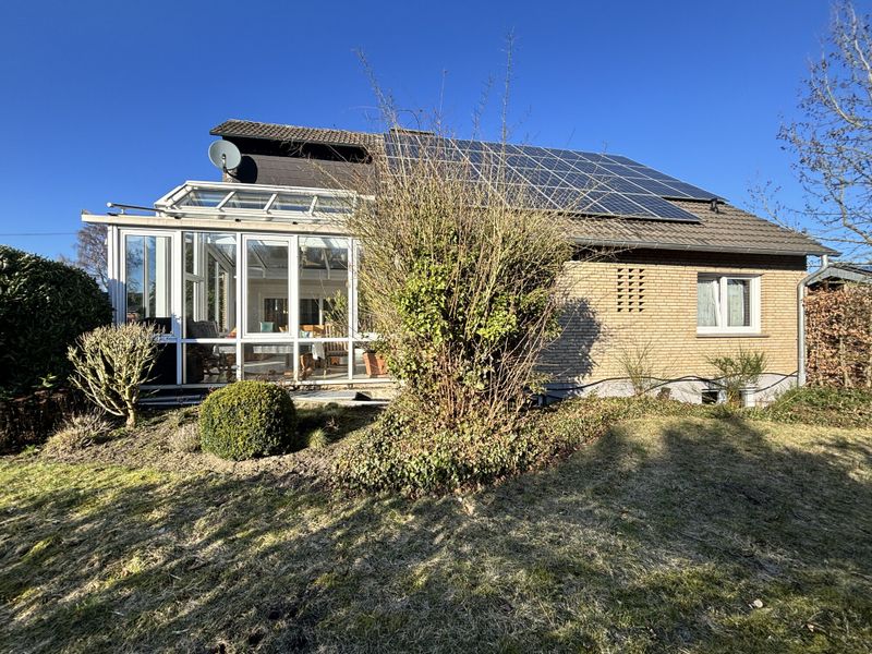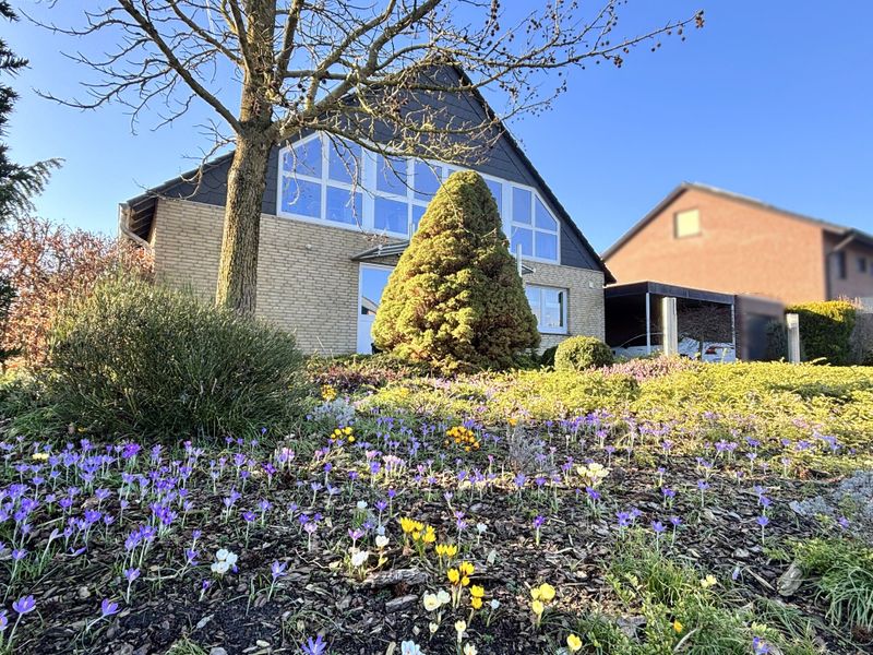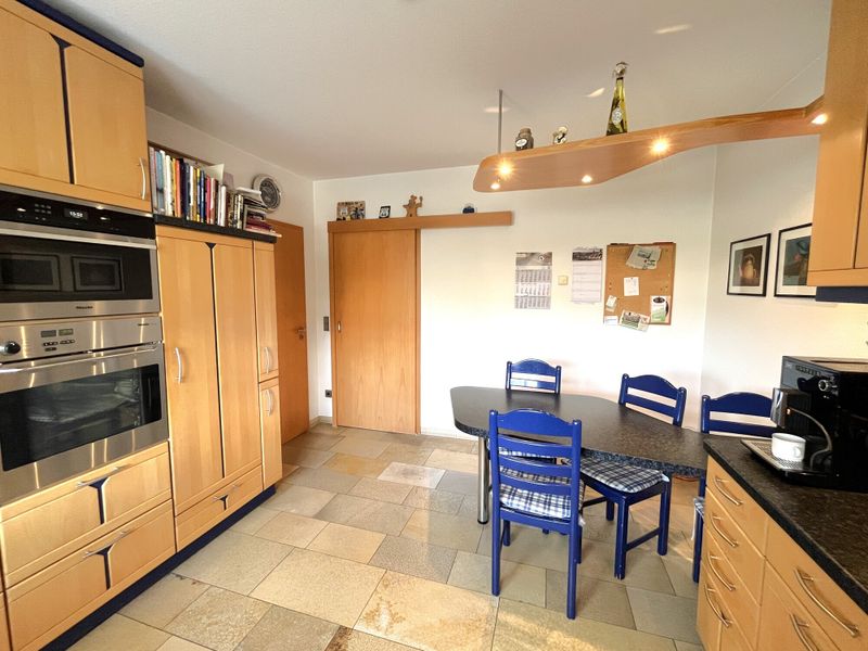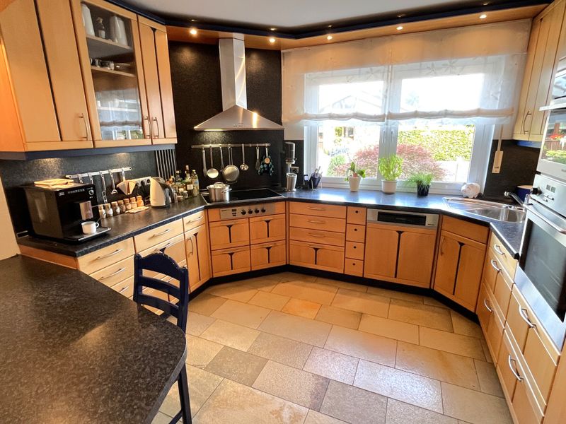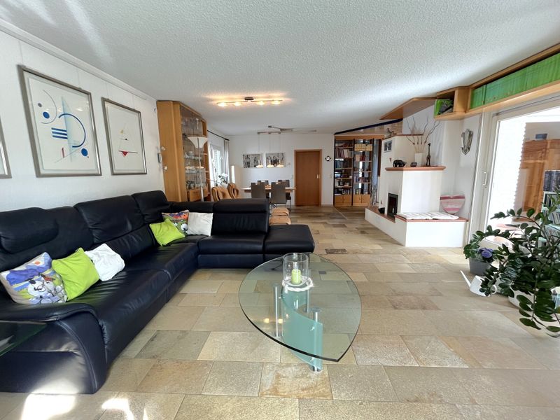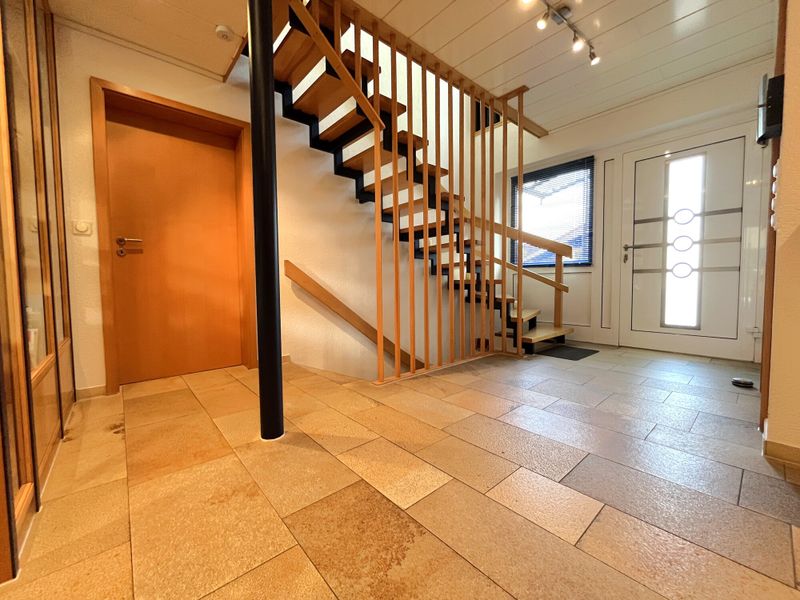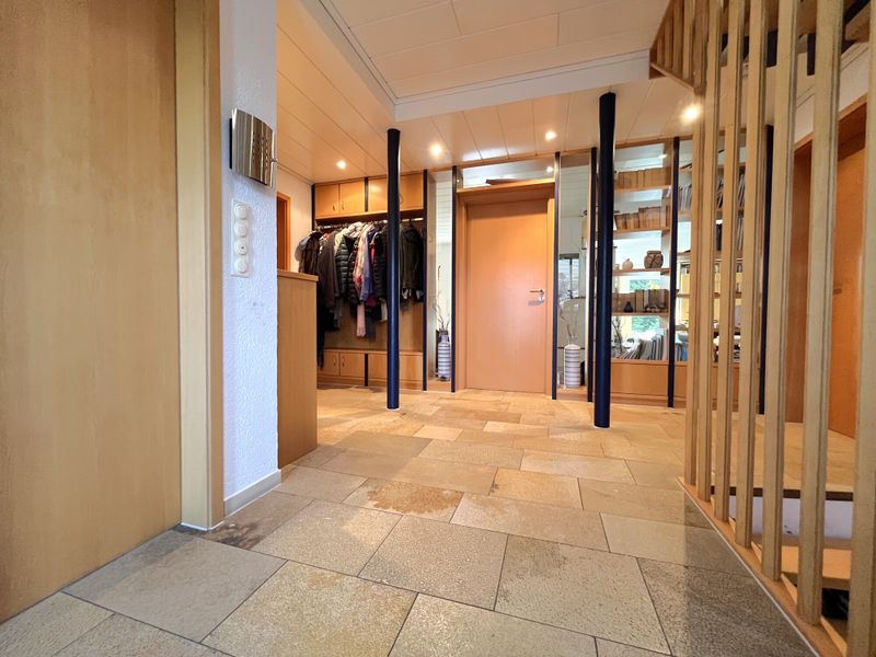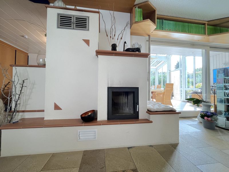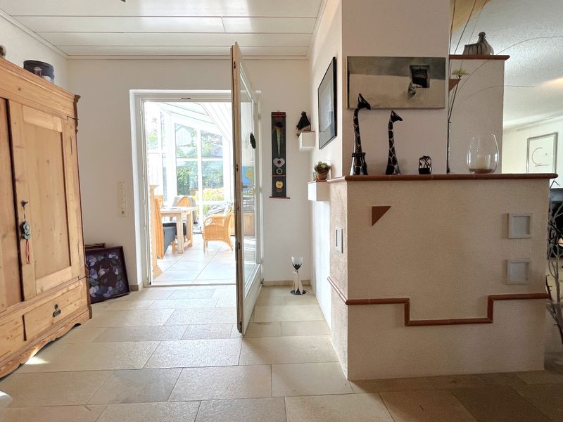 Das Haus wurde 1977 errichtet und präsentiert sich in einem äußerst gepflegten Zustand; eine umfassende Sanierung erfolgte 1997. Auf ca. 214 m² Wohnfläche verteilen sich 6 Zimmer, die durch ihre lichtdurchflutete Wirkung und eine stimmige Raumfolge überzeugen. Bereits der geräumige Eingangsbereich empfängt mit Platz für Garderobe und dem guten Gefühl, dass hier an Alltagstauglichkeit gedacht wurde. Von hier aus öffnet sich der großzügige Wohnbereich, der als Mittelpunkt des Hauses funktioniert und durch einen gemütlichen Kachelofen eine behagliche Note erhält. Im Erdgeschoss ergänzt eine Fußbodenheizung den Wohnkomfort, während Aluminiumfenster mit Isolierverglasung für zeitgemäße Funktionalität sorgen.