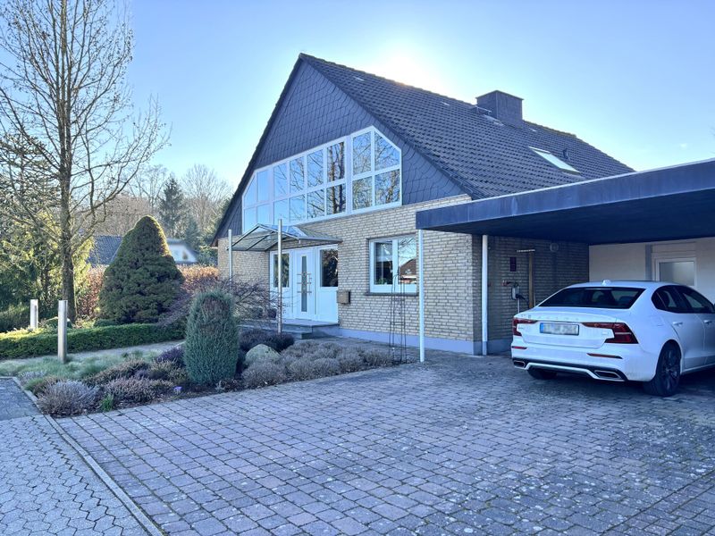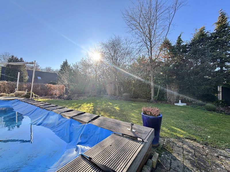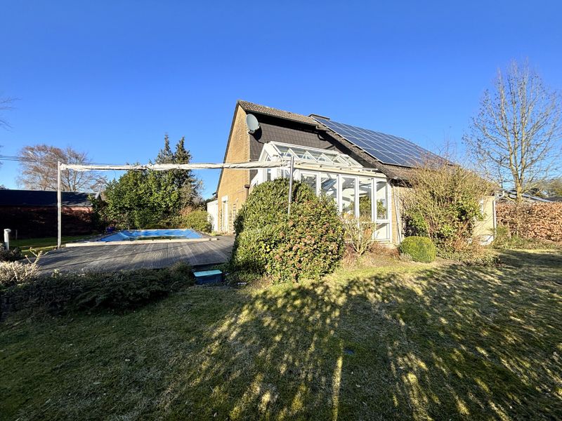 Das ca. 975 m² große Grundstück profitiert von einer optimalen Süd West Ausrichtung und ist mit viel Liebe zum Detail gestaltet. Ein Teich setzt einen ruhigen Akzent, während der Pool mit Gegenstromanlage den Garten in den warmen Monaten zum Treffpunkt macht, für Kinder, Gäste und alle, die gern zu Hause aktiv sind. Für Fahrzeuge stehen ein Doppelcarport sowie ein Fahrrad und Geräteraum zur Verfügung. Technisch ist das Objekt ebenfalls gut aufgestellt: Eine PV Anlage mit 12 kWp und 6 kWp Speicher aus 2023, eine intelligente Wallbox sowie Glasfaser schaffen zeitgemäße Voraussetzungen für Energie und Alltag.