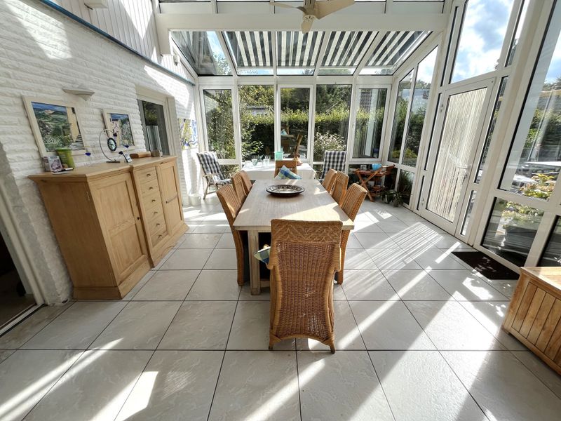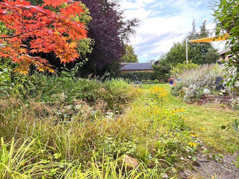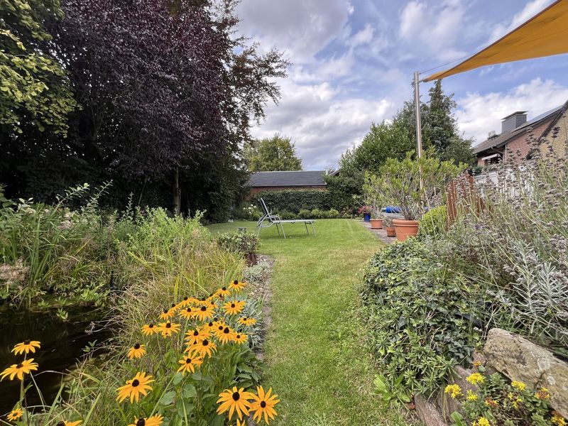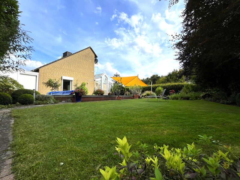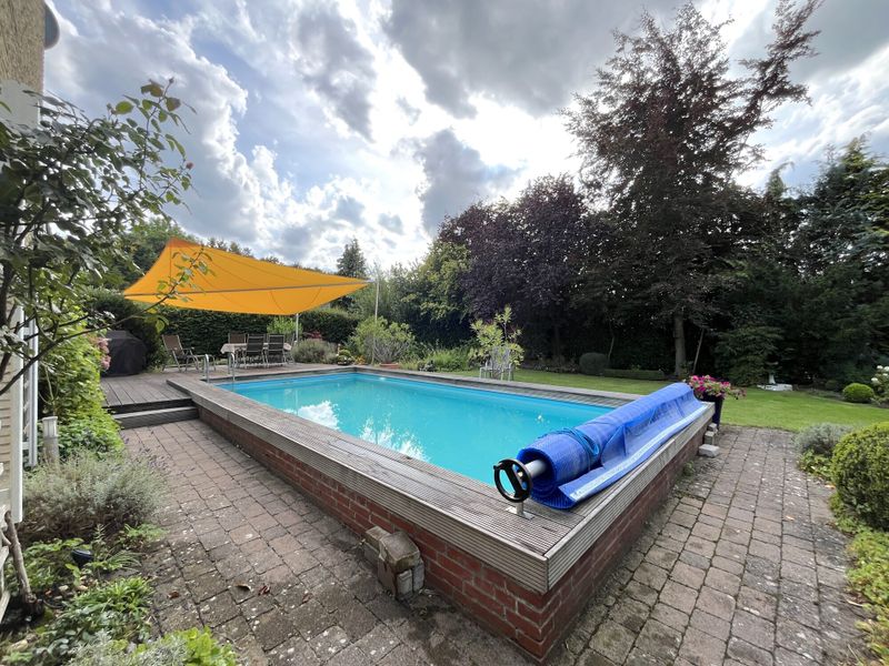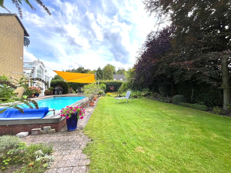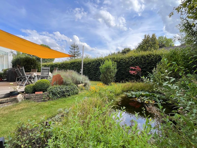 Ein weiteres Highlight des Erdgeschosses ist der hochwertige Wintergarten, der sich perfekt in das Wohnkonzept einfügt und den Blick auf den weitläufigen Garten frei gibt. Denn dieser lässt keine Wünsche offen: Ein erfrischender Pool für Sommertage, eine einladende Terrasse, umgeben von viel Grün und ein idyllischer kleiner Teich sorgen für Ihre private Wohlfühloase.