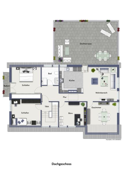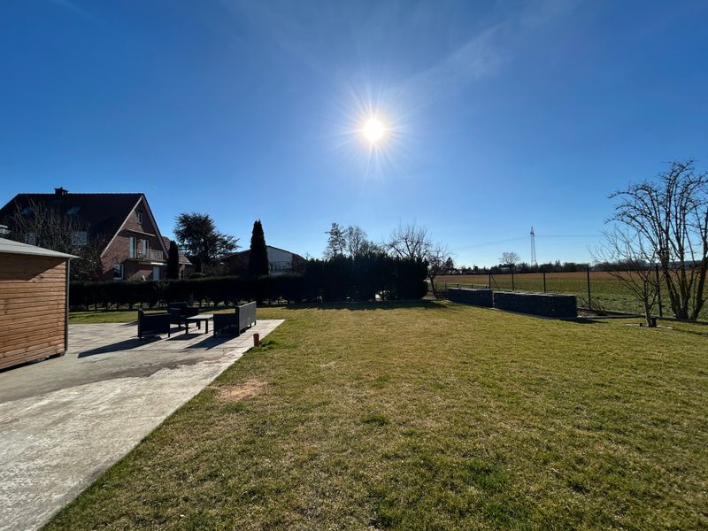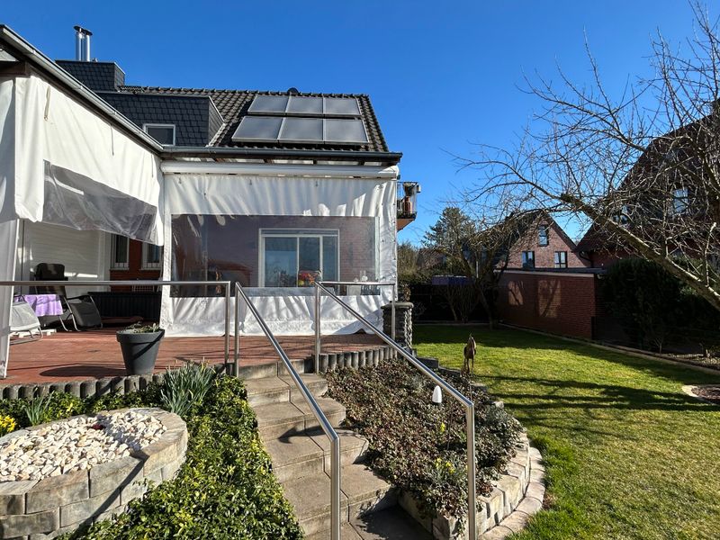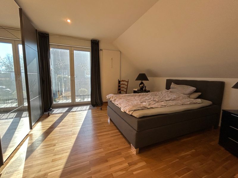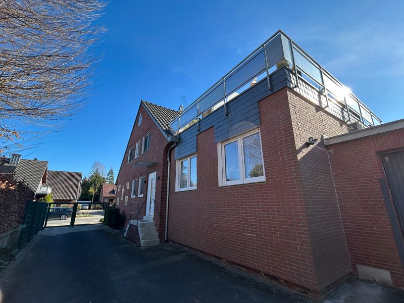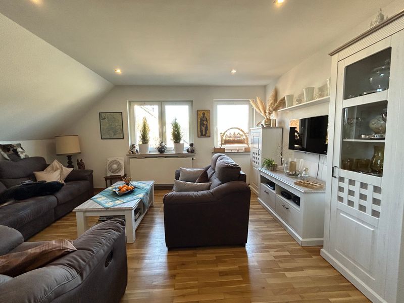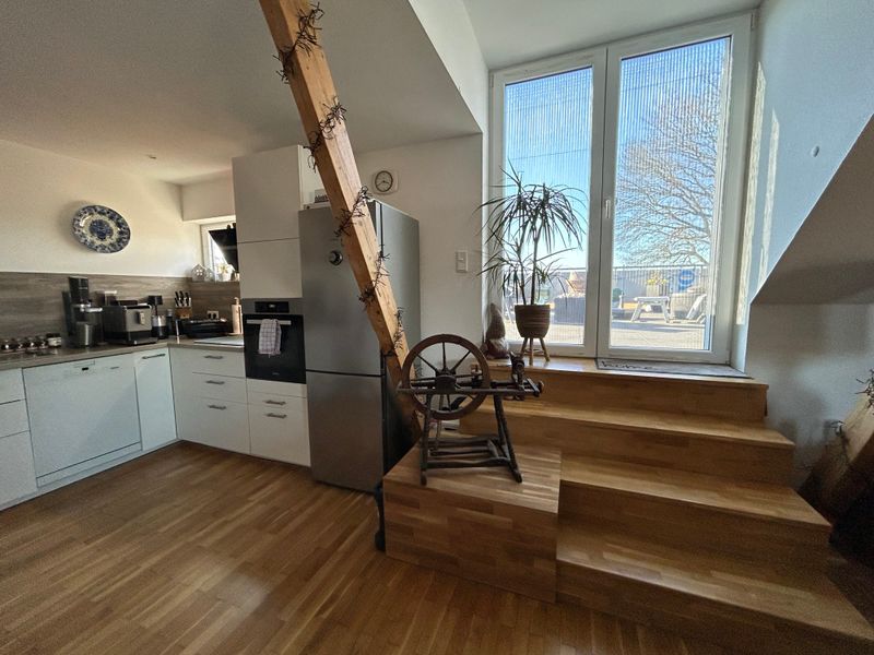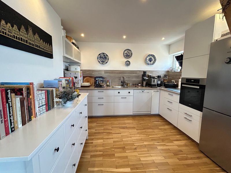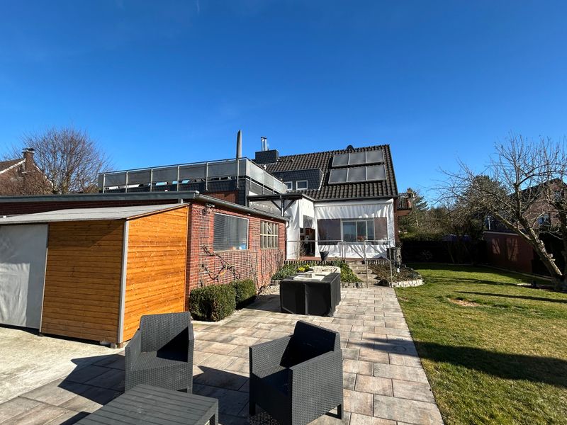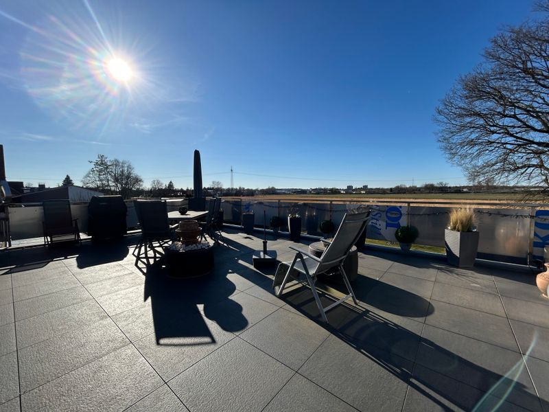 Ganz besondere Beachtung findet das herrliche Grundstück! Von hier aus haben Sie eine unverbaute Sicht über die angrenzenden Felder und Wiesen! Der gut konzipierte Außenbereich mit seinen Sitz- und Ruhebereichen kann sich sehen lassen! Ein ganz besonderes Highlight ist die großzügige Dachterrasse, die der Dachgeschosswohnung angehört!