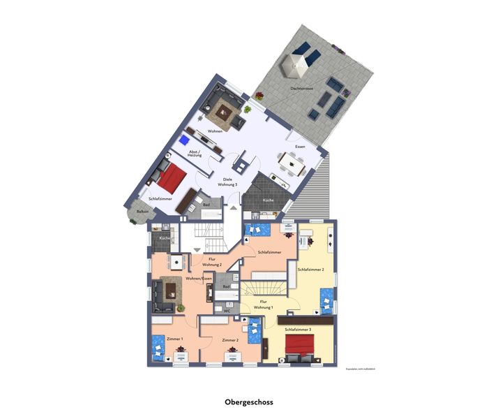 – 3 Zimmer, Küche, Diele, Abstellraum, Duschbad, Balkon, große Dachterrasse, Kellerraum