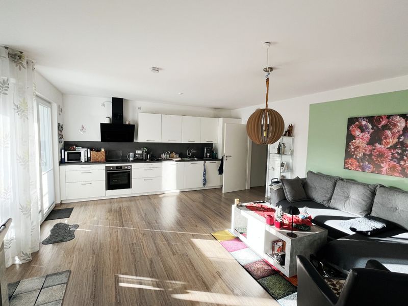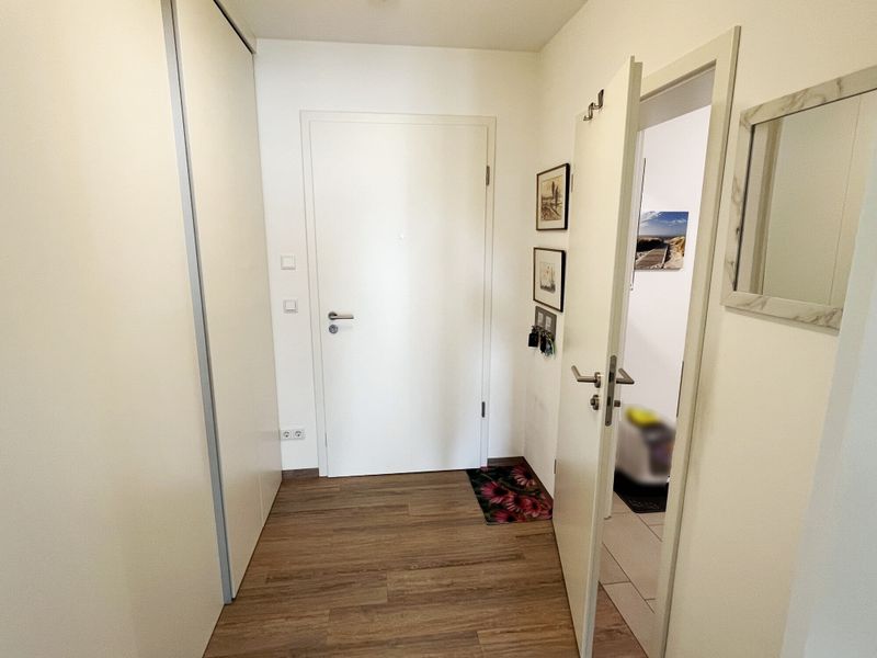 Eine Empfangsdiele führt Sie direkt in ein großes und helles Wohn- und Esszimmer mit integriertem Küchenbereich. Die angrenzende Loggia mit Ihrer Süd-Ausrichtung lädt Sie zum Verweilen ein. Ein Schlafzimmer in schöner Größe, ein modernes Badezimmer mit bodentiefer Dusche und ein praktischer Schrank im Dielenbereich mit Waschmaschinen- und Trockneranschluss vervollständigen diese schöne Wohnung.