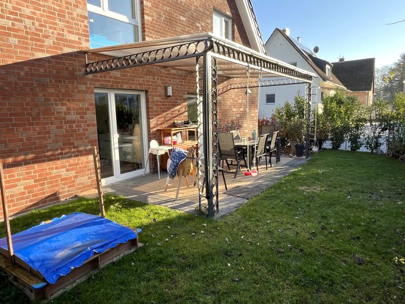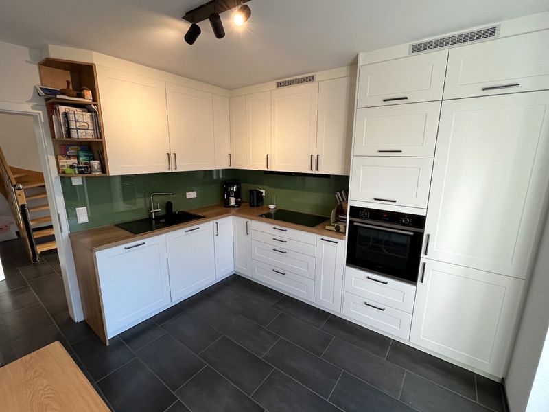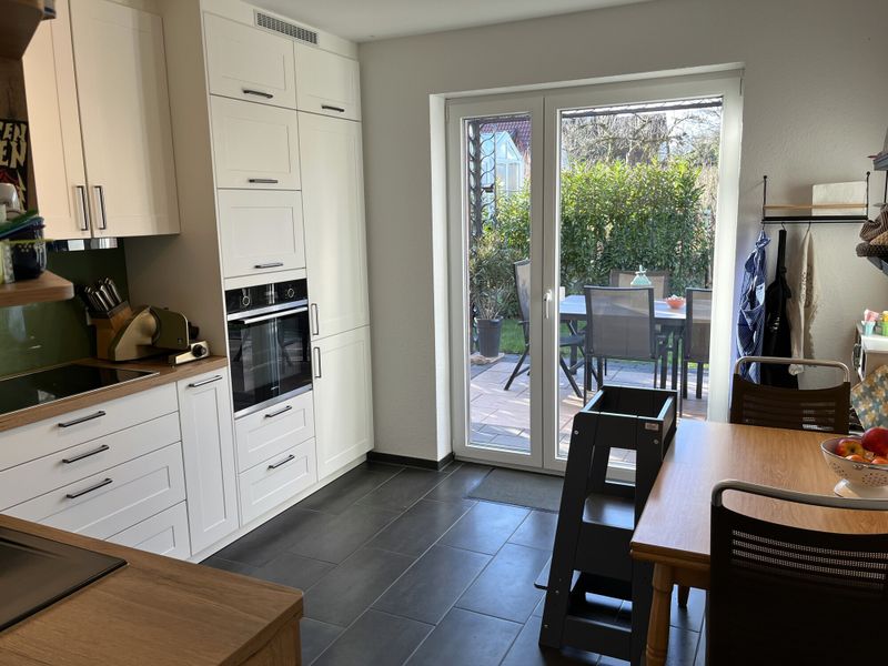 Die hochwertige Küche ist mit modernen Geräten ausgestattet und wartet förmlich auf gemeinsamen Kochevents. Von hier aus gelangen Sie direkt auf die sonnige Terrasse und in den liebevoll angelegten Garten, ein perfekter Ort für lange Sommerabende. Die praktische Gartenhütte bietet zusätzlichen Stauraum für Ihre Gartengeräte oder Fahrräder.